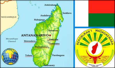 Помимо общей карты я решил показать вам флаг и герб страны. Флаг Мадагаскара был утверждён 21 октября 1958 года во время подготовки к референдуму о статусе страны относительно Франции, за два года до обретения независимости.