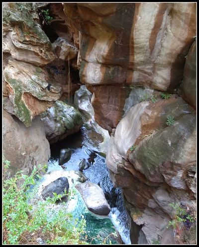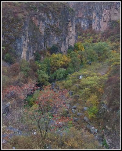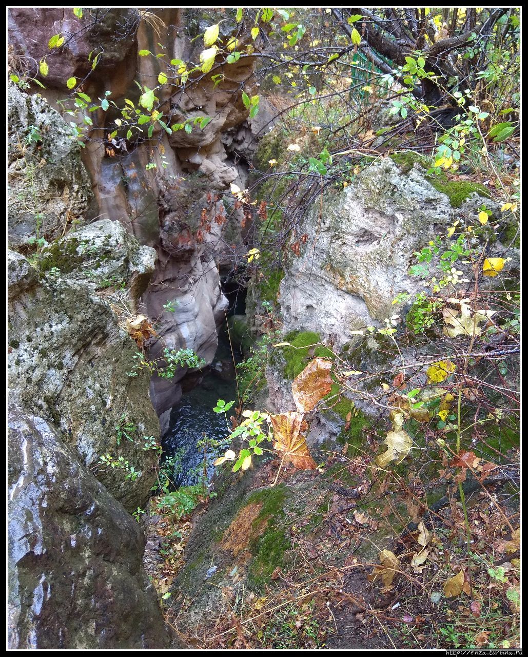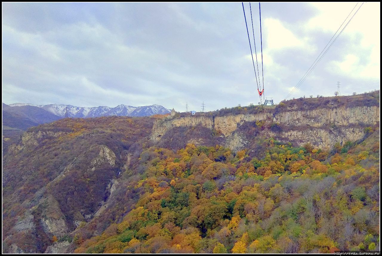 Из туннеля вода выбегает в широкий каньон, по краю которого стоит пройтись, чтобы полюбоваться видами. Осенью здесь было очень красиво – горят разноцветные листья, а над Чертовым мостом, в тумане скользят по стальным канатам, а, может, на крыльях вагончики подвесной дороги.