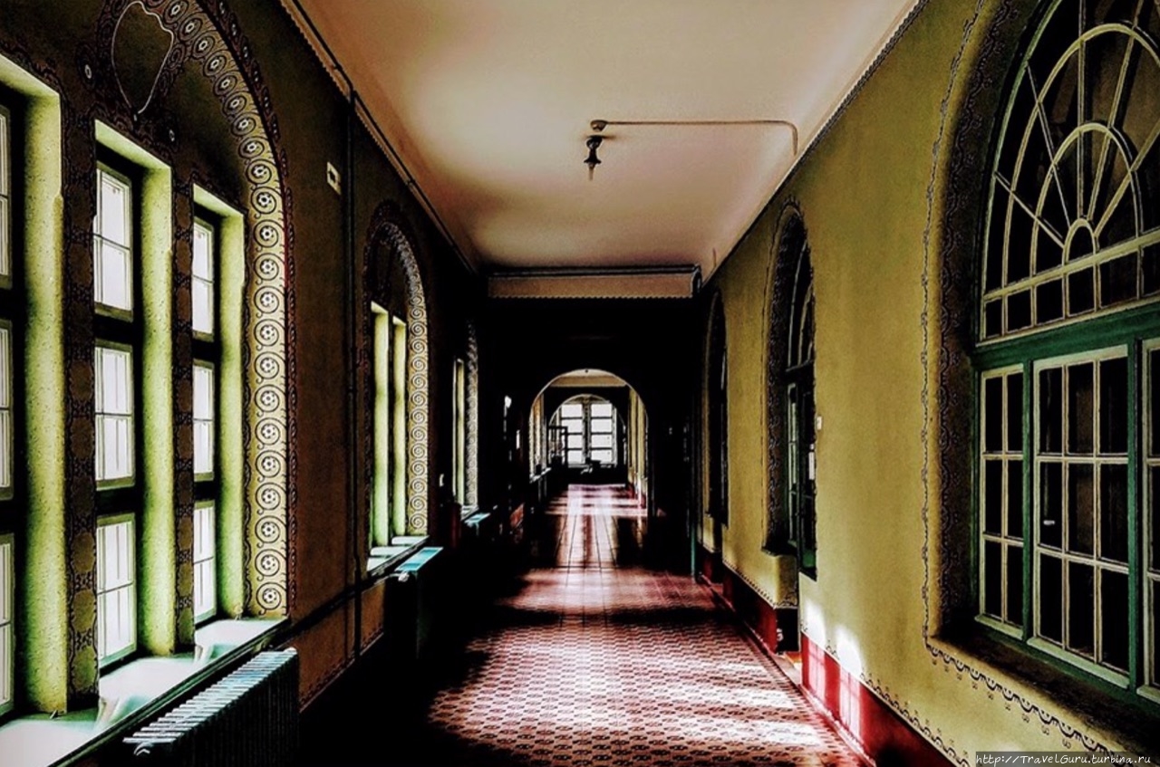 Торжественная лестница ратуши сделана из белого камня, стены лестницы выложены темно-зеленой плиткой.