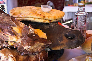 Про осетинские пироги Из напитков наибольшей популярностью пользовалось красное вино – разумеется, домашнее. Оно очень приятное и легкое. Но пьют здесь в таких количествах, что сложно выдержать неподготовленному организму, даже (или тем более) мужскому. А отказаться – значит, обидеть. Как выжить – непонятно. Тосты поднимает тамада. Причем, происходит все не так как привыкли мы, в России – тамада не бегает вокруг гостей, блеща шутками и остроумием. В Осетии он сидит во главе стола и с определенным интервалом поднимается и произносит традиционный и соответствующий случаю тост. Неподалеку, конечно же, расположились музыканты, застолье перемежается танцами. Если вкратце, то это и есть весь сценарий. Ну а подробности – по ходу фоторепортажа.