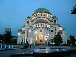 Если пройти далее по той же Савской к Храму Св.Савы. Архитекторы использовали классический византийский стиль эпохи правления императора Юстиниана I. Прямым образцом служила главная церковь Византийской империи — Софийский собор в Константинополе. Однако по своей планировке Храм Святого Саввы всё же отличается от константинопольского образца, так как здесь не было осуществлено слияние между базиликой и центральным строением. Элементом сербского средневекового стиля является добавление четырёх башенок вокруг главного купола. Очень красивое сооружение, особенно в подсветке. В 9-00 колокола вызванивают гимн Сербии.