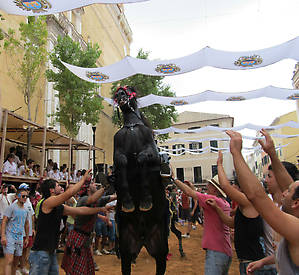 «Персонаж , играющий на флейте призывает всех всадников собраться на площади Plaça de la Constitució, для ритуального акта "jaleo", где люди пытаются поднять на дыбы лошадей»