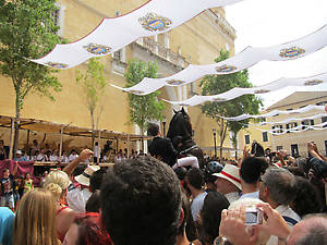 Для меня главной интригой праздника было участие лошадок!!! Чистокровной меноркинской породы. Скачки начинаются после обеда , а в 12.00 начинаются праздничные акты "jaleo".