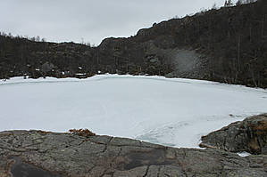 Маршрут начинается вот от этого камня и указателя. Тропинка, идущая через лес, начинает отсчитывать первые метры подъема. Пока все идет достаточно легко и непринужденно, что дает возможности для фотографирования вот в таком домике из мха. Близлежаюшие валуны так же покрыты мхом. Совсем скоро будет первая смотровая площадка с которой открываются виды стартовой площадки и озера Refsvatnet. Озеро еще спит, покрытое льдом.
