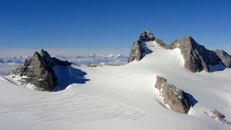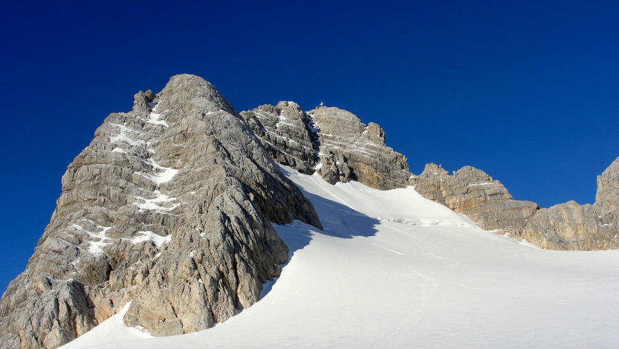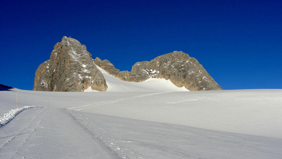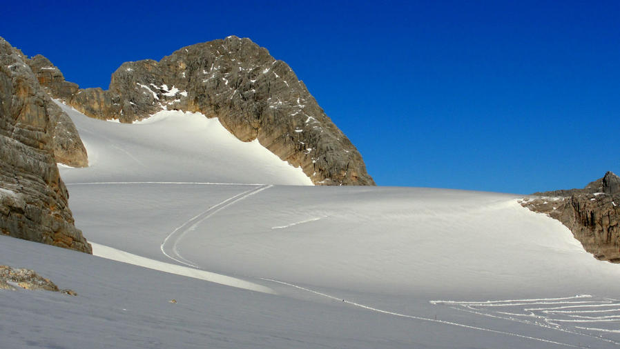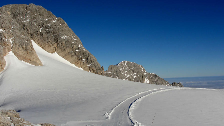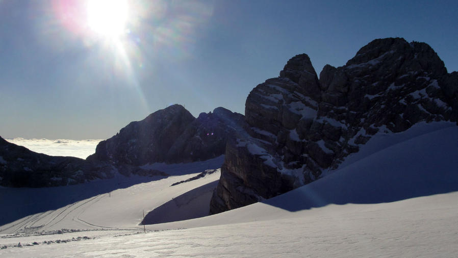 Внизу стала видна змейка лыжной трассы, а надо мной нависли скалы самой вершины Дахштайн. Были видны следы, уходившие к ней наверх. Их вчера оставили альпинисты, и оставят еще сегодня, но пока я тут совершенно один. И это все принадлежит только моим глазам.