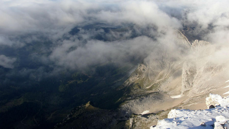 Собрался с мыслями. Окинул взглядом гору слева, с которой спустился. Сама то гора рядом, да вот перепад уже метров 300 сплошной сыпухи под таким же углом, а внизу практически, как потом оказалось, отвесная пропасть, высотой метров 200. Ну и ж...- подумал я, и выдохнув, пошел наверх. Сомнений нет, идти надо быстро. На мое счастье, сыпуху во многих местах держал очень прочный наст, за который неплохо цеплялись кроссовки. Палки убрал за спину, чтобы хвататься руками. На всякий случай. Следующие минут сорок, может больше, были просто сказкой. Пройдя 3/4 пути, наконец-то вышел на ту самую тропу, которая так неожиданно исчезла. Все, теперь я был спокоен. Поднявшись снова на вершину, увидел тех, кого обогнал в самом начале. Guten Tag!