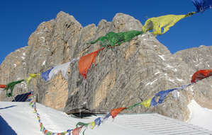 Дорога, проложенная ратраком завернула налево от скал и привела меня к обрыву, высота которого примерно 700 метров. Здесь стоит пустующий приют, увешанный традиционными флажками и крест на краю обрыва. Отсюда практически та же панорама, но на сей раз никого вокруг. Только я один наедине с мыслями и прохладным тихим ветром.
