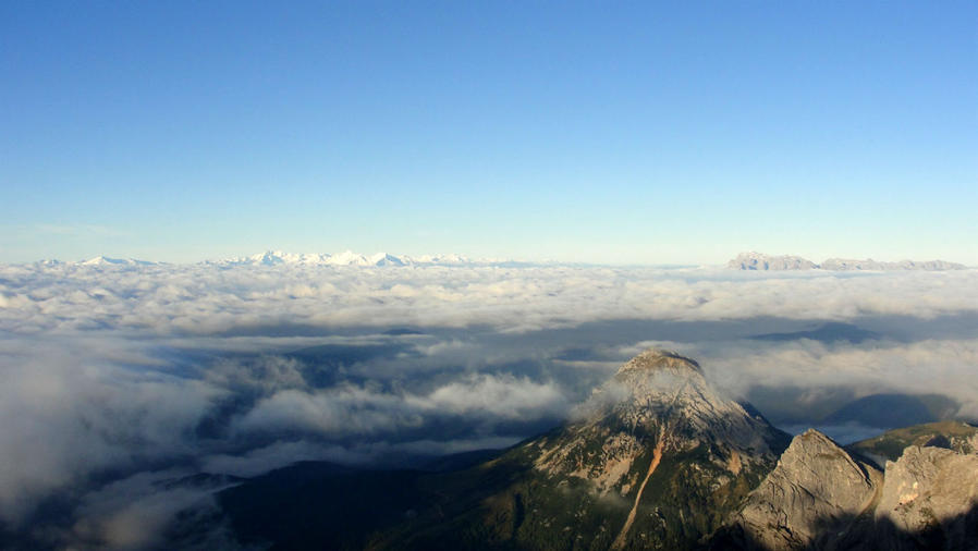 Первая кабинка по расписанию дает одно большое преимущество. Ты оказываешься на леднике раньше всех, примерно в 7.45 по местному уже наверху. В таком случае можно застать момент, как Солнце выкатывается из-за левого отрога массива и освещает собой бескрайнее море облаков внизу под тобой, а впереди Высокие Альпы и величавый Гроссглокнер. Эта панорама достанется тем, кто выйдя из кабинки, не устремится за лыжниками, а повернет направо и попадет на смотровую площадку. Зрелище — просто не земное. Искреннему восторгу нет предела. Wow-эффект достигнут мгновенно.