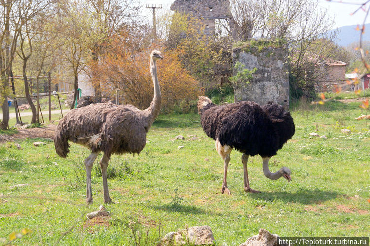 Из Фетхие мы поехали в Гёджек, расположенный в 30 км севернее. По дороге заехали в брошенный город Кайакёй – остатки Греции на территории современной Турции. До турецкой войны за независимость здесь проживали греки, однако они вынуждены были оставить Кайакёй в 1923-м году. С тех пор их дома пустуют. Впечатление потерянности — стоит огромное количество домов и все нежилые. Любителям развалин предлагаю почитать здесь mazko.ru/2011/10/31/kayakey/. Грустное настроение развеяли страусы, которые паслись на лужайке.