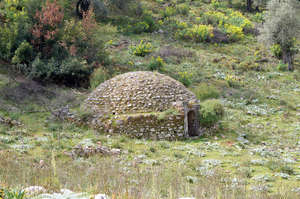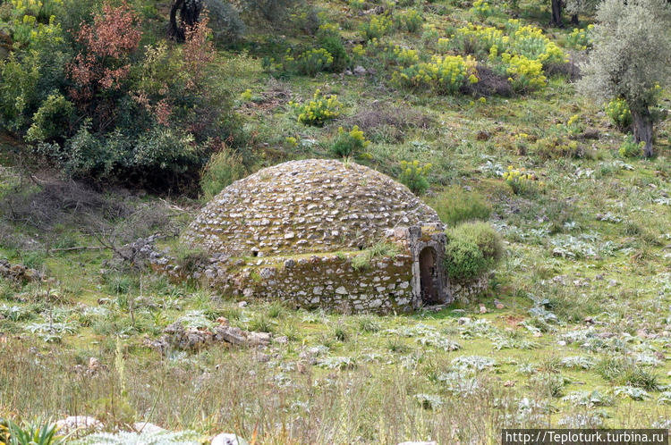 На лужайке мы нашли странной формы античное строение, чем-то похоже на дольмены. Это сферообразный купол над цилиндрическим каменным погребом с лестницей. На полу кости животных. Вход завален колючим кустарником.