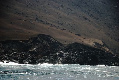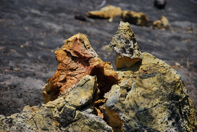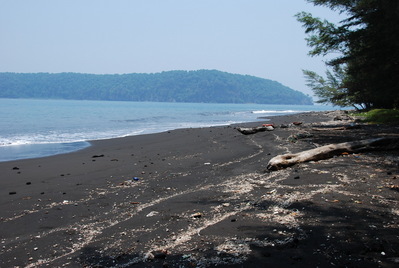 С действительно черным рассыпчатым песком пляжа (кстати, и снорк здесь неплохой) и следами прошлых извержений...