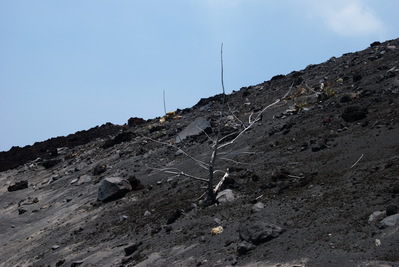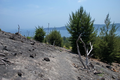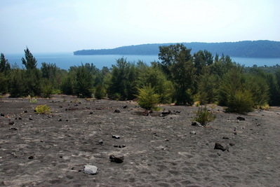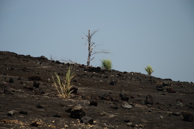 Сначала объезжаем вулкан вокруг. Кое-где, уже заросли. Но местами все еще выжженная пеплом поверхность...