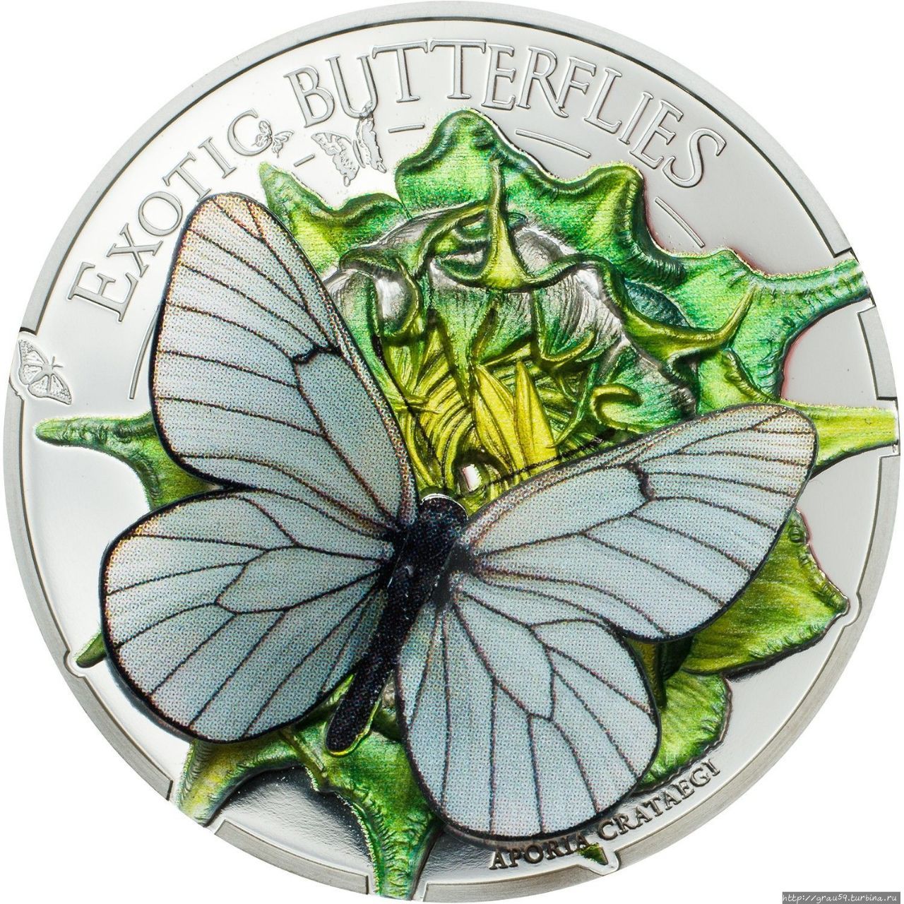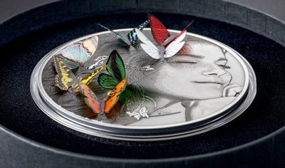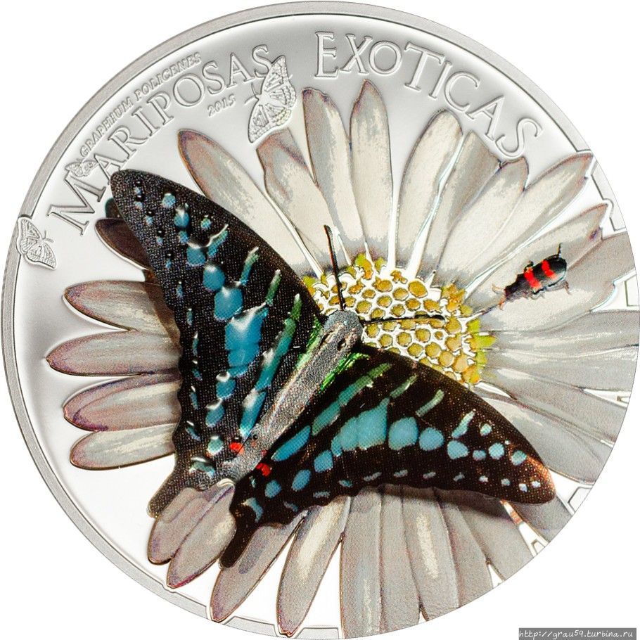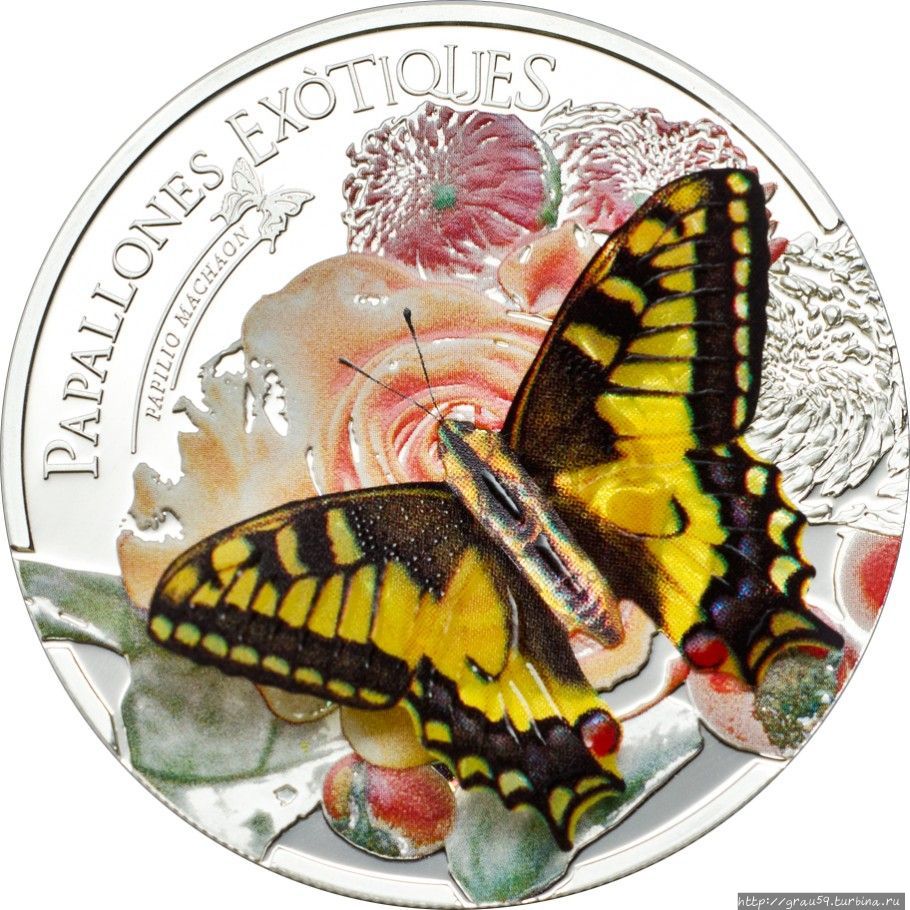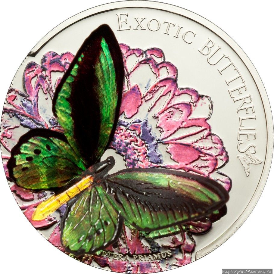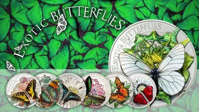 Но она останется на месте — это одна из монет серии "Exotic Butterflies in 3D". Эта серия выпускалась с 2011 по 2018 год компанией CIT Coin Invest AG из Лихтенштейна, каждый раз эмитентом выступала новая страна и на монете появлялась новая бабочка, за исключением 2018 года.