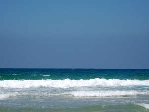 То ли свет от воды отражается, то ли воздух соленый и в нем свет по-другому рассеивается. Но цвет неба не лазурный, а светящийся. Как будто в бирюзу добавили капельку белого, полкапельки зеленого и много-много света.У нас 72 часа тишины. Само собой, я уже 2 дня на море. Солнышко жарит, ветерок с моря дует, водичка теплая и прозрачная. Только волны бьют вовсю. Берег нас встречает черными флагами. Впрочем, есть участки, где купаться можно.