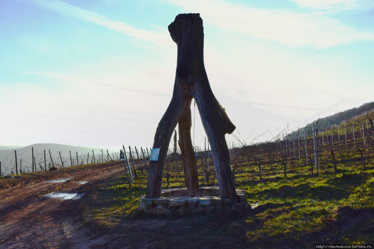 Сначала я ее увидел издалека, ничего не понял. Подошел поближе, удалось разглядеть детали, но все равно было ничего не понятно. Если на фото видно недостаточно, то вот описание — перевернутый необработанный ствол дерева, поставленный на ветви таким образом, что можно к центральной верхней точке подвесить груз. Груз висит на железном пруте, имеет возможность раскачиваться во всех направлениях. Снизу сделана небольшая кладка, внутрь которой насыпан песок.
