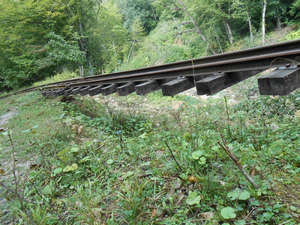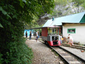 Через пару дней двинулись в Гуамку, во времени были ограничены, поэтому пришлось двигаться дальше. Дорога в ущелье идет прямо по старой железной дороге. Местные сказали что проход по узкоколейке платный, и посоветовали стоять на том что денег у нас нет. В общем на деле оказалось что большая часть пути там где дорога разрушена бесплатная естественно, а вот дальше где дорогу частично восстановили курсирует вагончик и что бы пройти дальше нужно купить на него билет. Можно конечно дождаться вечера и вроде бы тогда можно пройти свободно, но на вагончике тоже интересно проехать. За 10-ть минут такой поездки берут кажется в районе 200 рублей. Дороговато. зато внутри рассказывают историю мест, на пятой минуте эффектно сообщают о том что ездить так довольно опасно обвалы никто не отменял, с левой стороны внизу в ущелье можно увидеть смятый вагончик который когда-то снесло вниз.