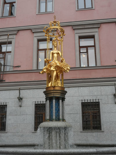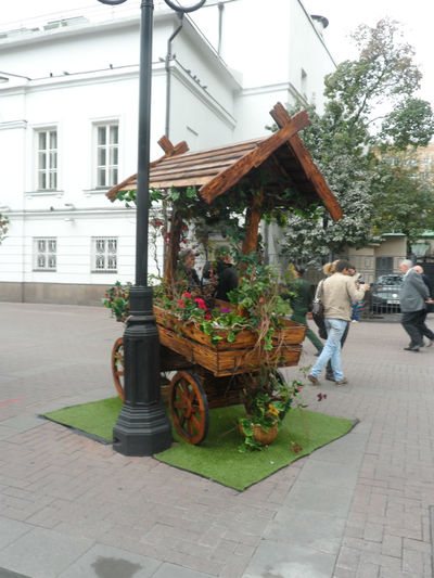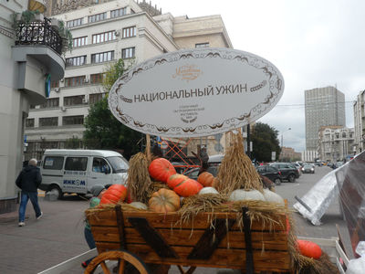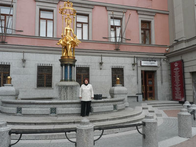 Впечатления: всех художников, сувенирные лавки, что тянулись по центру убрали, лишь в одном месте щедро раскинулась Осенняя ярмарка . Торжественно встречает на одном из домов портрет Георгия Жукова, впечатлило.....Булат Окуджава на месте, тихо бредет по арбатским переулкам, традиционный обед в любимом кафе МУ-МУ. У несравненной золотой прелестницы Турандот полюбовались фонтаном и сделали фото на память, тут же познакомились с молодой московской парой, слово к слову,дружеские приветствия,и поцелуй руки на прощанье....