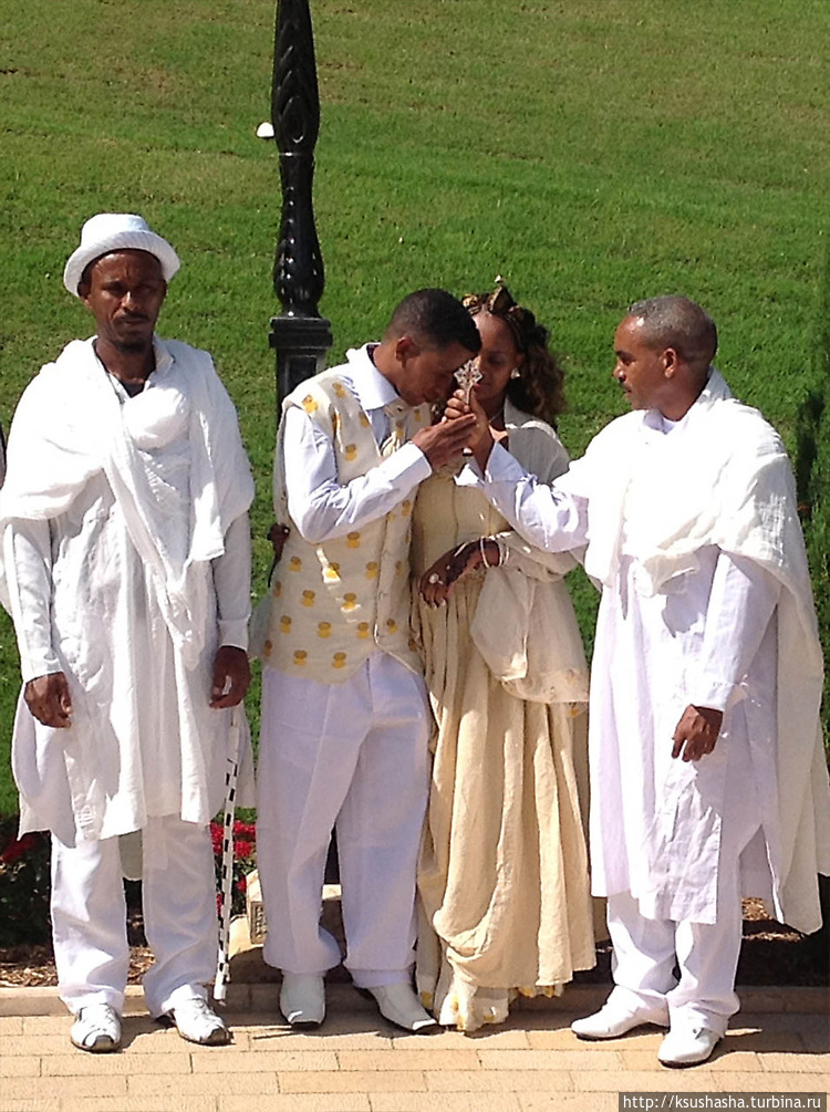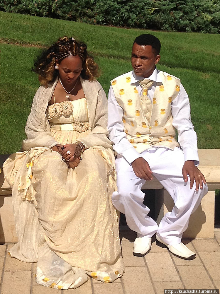 Сразу при входе на нижние террасы в глаза бросилось нечто необычное, такое яркое, что даже отвлекло на время наше внимание от сада и его красот. Это были эфиопские свадьбы. Причем, сразу две.