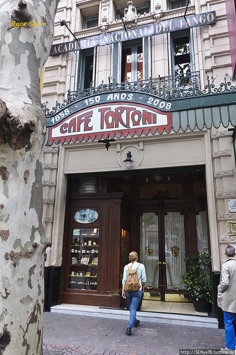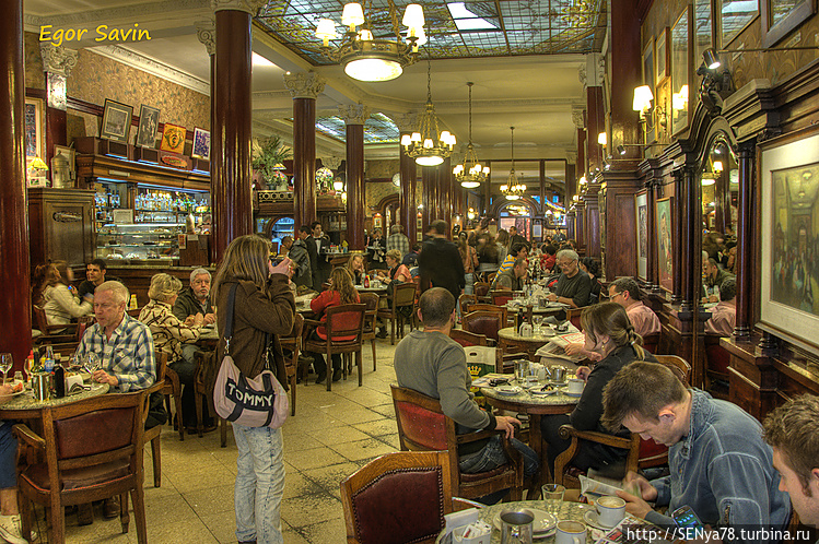 На метро мы добрались до авениды 9 июля, откуда снова, уже при свете дня, добрались до президентского дворца и до Моста женщины, творения архитектора Калатравы. Затем прогулялись по улице Флорида, где уйма всяких магазинов, только вот сувенирных почти нет. Посетили кафе Тортони, старейшее кафе в городе, знаменитое тем, что в него захаживали многие местные и не только знаменитости (Карлос Гардель, Хорхе Луис Борхес и многие другие). Здесь было людно, но несколько свободных столиков было, так что мы немного посидели за маленькой бутылочкой вина и поглазели по сторонам.