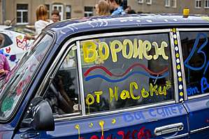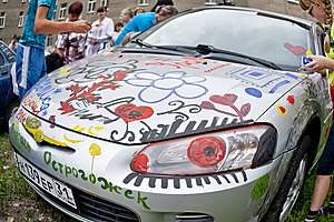 В Воронежской областной клинической больнице № 1 придумали уникальное развлечение для детей, которые здесь проходят лечение. Назвали эту акцию, которая проводится совместно с «Союзом добровольцев России» — арт-терапия на колесах. Предлагаю посмотреть репортаж с этого веселого действа и улыбнуться! Мне приходит на ум сразу строчка из детской песни «За пять минут кистью умелой мир черно-белый разрисуют чудаки!» Почаще бы проводились такие красочные и веселые акции. И что удивительно — отбоя нет от водителей, желающих поучаствовать в вернисаже на колесах. А гуашевые краски потом легко отмываются на ближайшей мойке. Я для себя сделал вывод, что лучше всего рисовать на белых машинах, — они как будто созданы для этого вида творчества... Хорошего вам настроения! И пусть будет меньше в нашем мире больных детей…