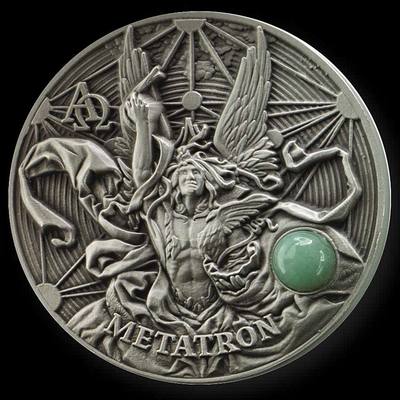 На реверсе серебряной монеты изображен Метатрон. В нижней части полукругом выгравировано его имя – «METATRON», справа расположена круглая вставка из авантюрина.