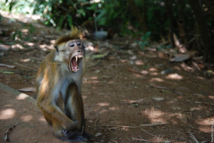 Приезжаем в сад. Вход 600 рупий. Приятное место. Зелено, тихо очень. Народу нет совсем. Бамбук растет огромными кустами, традиционные парочки на каждой скамейке и под каждым кустом сидят. Романтичная здесь молодежь, красивые места для обниманцев выбирает. Внизу по траве шарятся белки. Птички поют. Хорошо. Идем дальше – о, обезьяны! Целая стая, почти ручные. Простояли около них целый час. Смешные такие, мне они гораздо больше слонов нравятся. Каждую минуту что-то отжигают. Чешутся, дерутся, блошек друг у друга и ищут, по веткам бегают, какие-то шарики катают из грязи, сидят лапки скрестив. Местный парень кидает им пакет из-под какой-то еды, те задумчиво копаются в пакете, точат, что нашли. Дима налаживает контакт – протягивает листик. Обезьянка берет, нюхает, выкидывает. Дима протягивает палочку – взяла, поковырялась в зубах. Уморные они все-таки. А когда зевают – пасть как у собаки, клыкастые. Ладно, насмотрелись вдоволь, идем дальше.