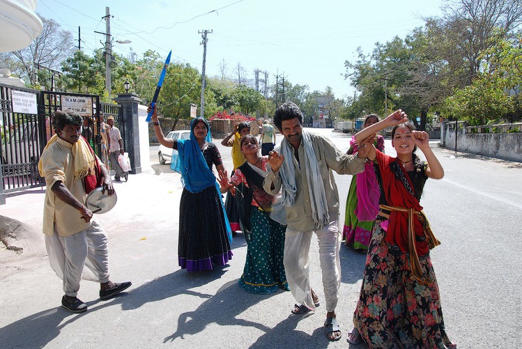 Впереди у ворот частного дома калядует “группа добровольцев″. Бьют в бубны, поют, пляшут. С чувством так :) Правда, просят у меня 50 рупий за просмотр танцев. Сбегаю от них к очередным поздравляльщикам с разноцветными пакетами.