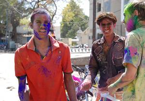 Успеваем только выйти на улицу и перейти дорогу, как к нам уже поворачивают два мотоцикла с разноцветными индусами. “Это по нашу душу” - тихо и вкрадчиво комментирует Юра. Ну, я их могу понять. Холи на дворе, а тут чистые европейцы шастают.