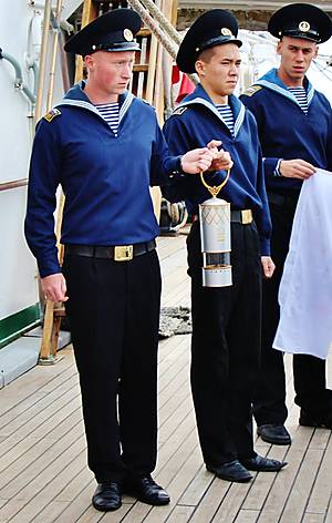 Капсула с огнем, оберегаемая специально выделенными хранителями огня из числа курсантов, проходящих практику на барке "Седов", проделала путь от французского Бреста, через Атлантику, вдоль побережья Южной Америки, вокруг мыса Горн, через Тихий океан к родным берегам.