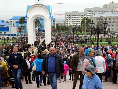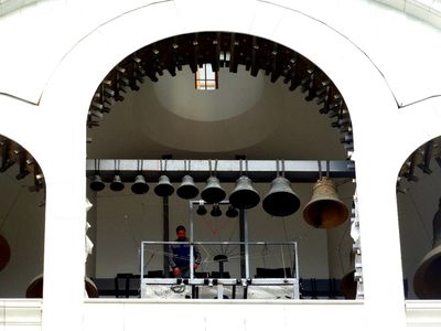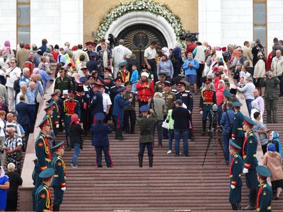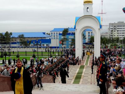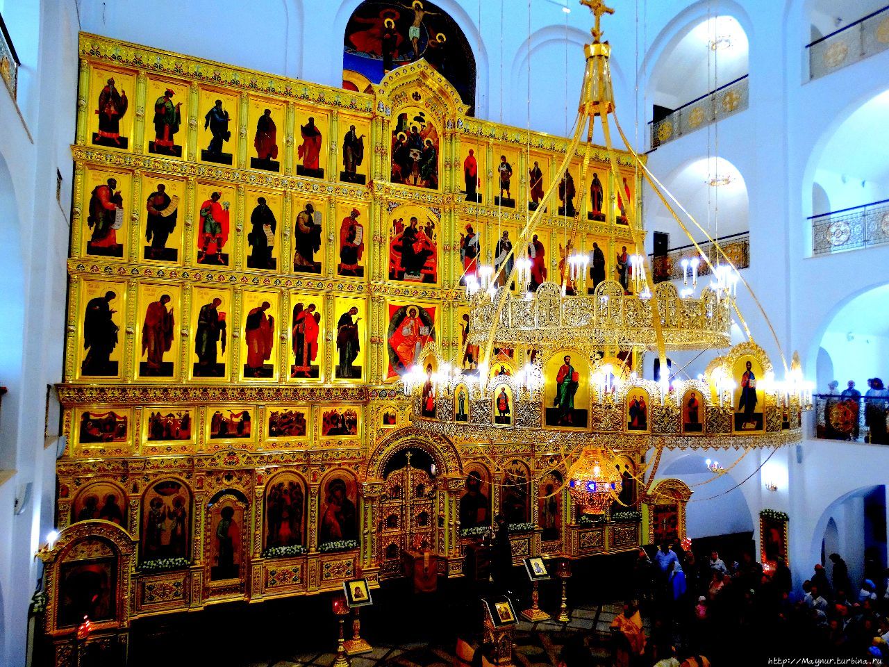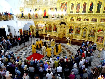 и виден отовсюду.Освящение храма было назначено на 4 сентября, но накануне, 3 сентября, прошла первая вечерняя служба, о которой многие не знали и мне удалось сделать снимки внутренного устройства собора при небольшом стечении людей.