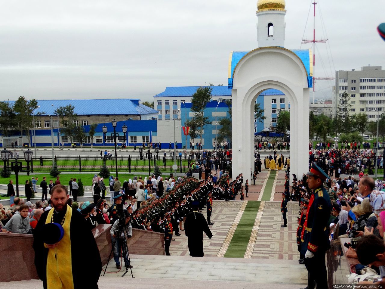 Его поставили на возвышении в районе площади "Победы" на месте, подсказанном Патриархом Кириллом в его первый приезд на Сахалин в 2010 году.