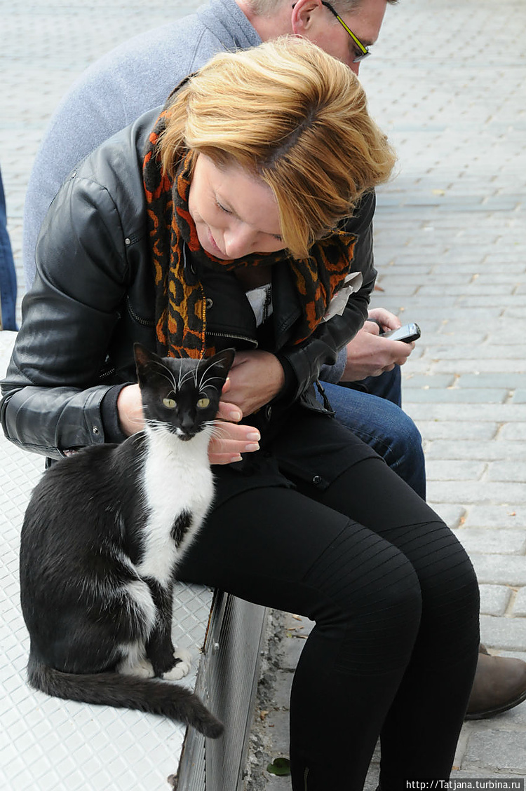 два рыбака видимо случайно зацепили рыболовным крючком чайку ( чайки наверное летали низко и схватывали на лету рыбку). Идет обсуждение, как ей теперь помочь..— Туристы ласкают кошечек