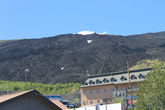 Этна, показавшись из-за горн, немедленно приковала к себе взгляд и затмила своей горделивой красой все вокруг. Она была одета во все черное, усыпанная белыми каплями снега на макушке.