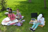 расположившись прямо на траве.А мальчики бегают с самолётами.