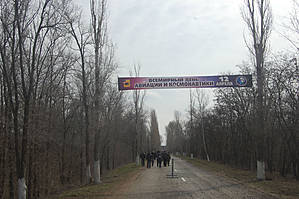 Дорога в сторону мемориала была разделена на две части, отделенные друг от друга белой полосой. Вдоль неё стояли солдаты в бушлатах, чтобы не дай бог люди не вышли на дорогу под колёса избранных автомобилей и автобусов. Многие из солдат грызли семечки, чтобы убить время. С утра людской поток проверяли перед входом на дорогу к мемомериалу, ближе к обеду проверки на входе на дорогу закончились. Кстати, возле центрального места праздненства было много кинологов с собаками.