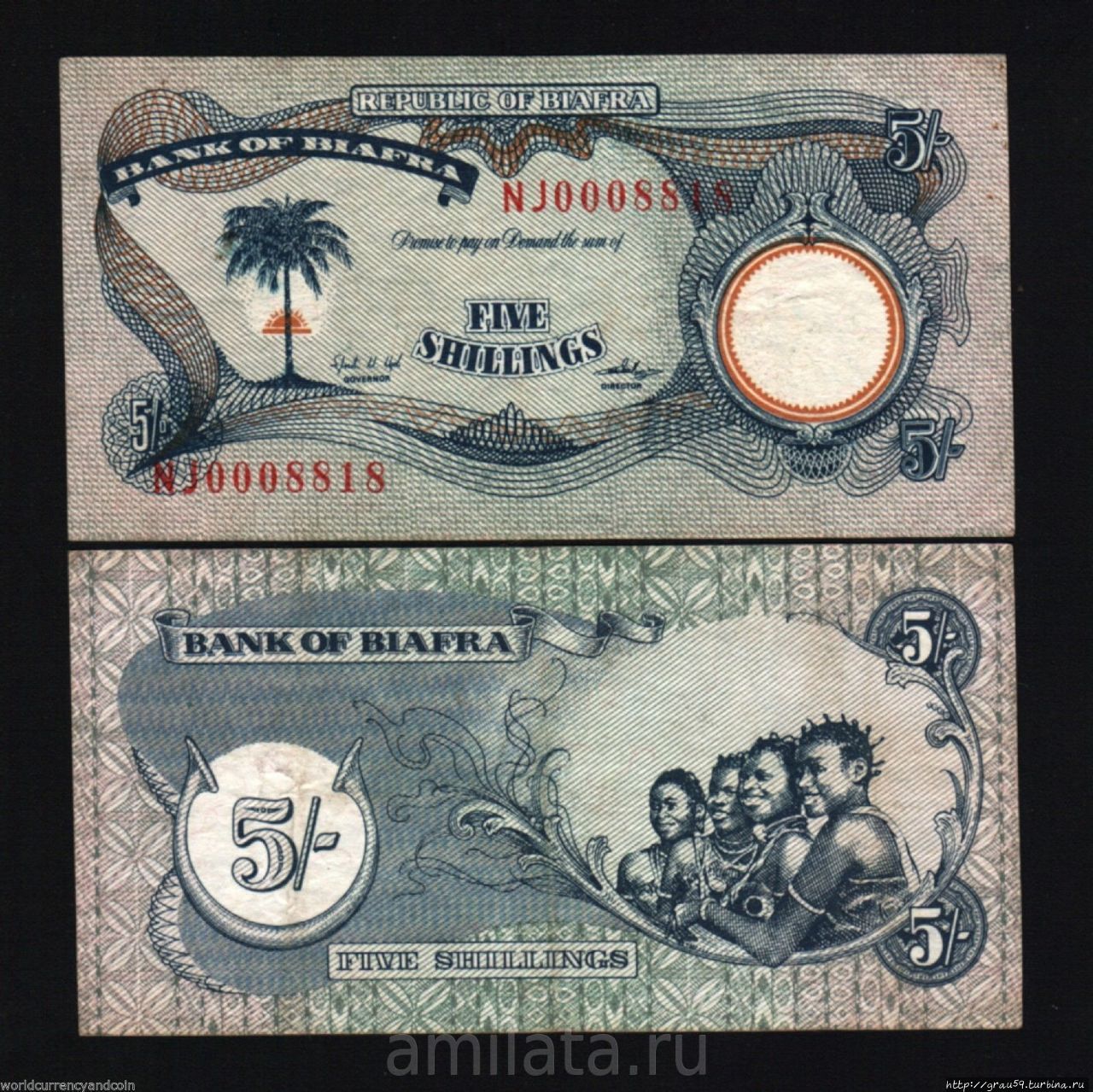 Первый выпуск банкнот Биафры номиналами 5 шиллингов