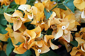 Самое удивительное, но красоту растению придают не его Цветы...а три видоизменённых листочка, которые обрамляют невзрачный цветок. Эти листочки, называемые Прицветниками, окрашенные в разнообразные яркие цвета, и являются основным Украшением Бугенвиллии. А скромный цветок скромно притаился в самом центре роскошного прицветника. Прицветники могут быть разнообразной формы: треугольные, округлые, сердцевидные, а края продолговатые, волнистые или пальцевидные.