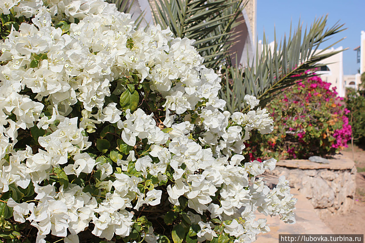 Разнообразную разноцветную красоту зимнего Египта создаёт и оставляет в памяти именно это растение... Бугенвиллия.Уверена, что у каждого, приезжающего с отдыха из Египта, есть фото, сделанное на фоне этого чудесного растения. Отдыхающие в этой стране нередко описывают отдых в Египте одной фразой "Я побывал в Раю..." и во многом — это заслуга Бугенвиллии, которая создаёт своей разнообразной палитрой красок, ощущение праздника.