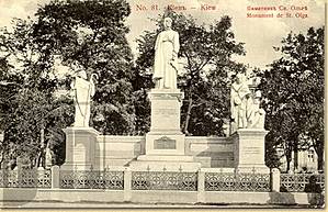 На постаменте из розового гранита была установлена композиция, в центре которой было расположено скульптурное изваяние княгини, слева, на возвышении, стояла скульптура апостола Андрея Первозванного, указывающего на «Святые горы киевские», справа на возвышении — скульптура сидящих просветителей славянских народов Кирилла и Мефодия. На постаменте княгини Ольги надпись: «Сия первая вниде в Царство Небесное от Руси, сию бо хвалят руские сынове яко начальницу», ниже следовала другая надпись: «Дар Государя Императора городу Киеву. Лето от Р. Х. 1911».