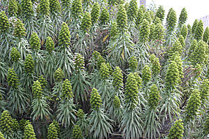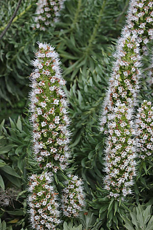 Молочай канарский (Euphórbia canariensis) Не надо путать с другим Молочаем, тоже часто встречающимся на Канарских островах, с Молоча́ем вели́ким ( Euphórbia ingens).4. Синя́к просто́й ( Echium simplex) — травянистое двулетнее растение рода Синяк (Echium) семейства Бурачниковые (Boraginaceae). — Эндемник острова Тенерифе. У этого растения существует брат-двойняшка Синя́к Ви́льдпрета (лат. Echium wildpretii) — тоже эндемник острова Тенерифе. Синя́к Ви́льдпрета более декоративен, чем его брат Синя́к просто́й, у него не белые цветы, а насыщенно красные. Синя́к Ви́льдпрета в простонародье называют: башня драгоценностей, красный буглос, буглос Тенерифе, буглос горы Тейде. Испанцы называют это растение ( tajinaste) -Тахинасте. Этот древний цветок сохранился только на Тенерифе. Видовое название этого растения дано в честь швейцарского садовода и ботаника Германа Вильдпрета (1834—1908). Его можно встретить на плато Лас Каньядас (Las Canadas). Он распускается в конце мая и цветет всего несколько дней. Красные колосовидные соцветия тахинасте достигают высоты 3 метров. В этой февральской поездке я его не увидела... Но я не расстраиваюсь, ибо на Канарские острова стоит вернуться !!! И мы обязательно познакомимся ещё с одним красивым эндемиком острова Тенерифе — с растением Синя́к Ви́льдпрета ( Echium wildpretii).