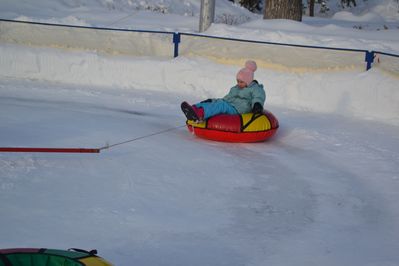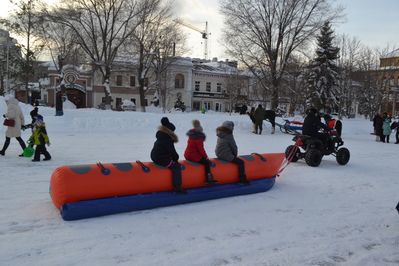 , благо горок целых три, и на катке. На лошадях верхом, в повозке и на "банане". На импровизированной карусели взрослые кричат детям — "Может побыстрее сделать?" и те дружно отвечают — "Да!".А кое-кто из детей используется человеческий труд.