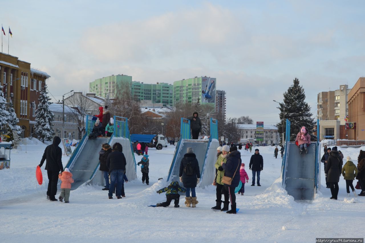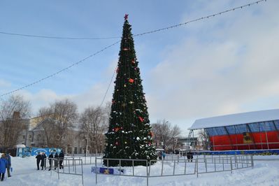 возле неё большая елочная игрушка, а при входе в городской парк арка, похожая на ледяную.Ну как обойтись во время отдыха без прилавков и импровизированного тира.