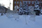 Возле дома, где находится администрация районе и города, собралась тусовка снеговиков -музыкантов.