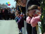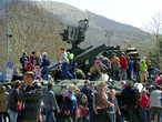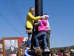 несколкими рядами за барьером оцепления томились зрители, на самом оцеплении гроздьями висели дети .Наконец автобусы с ветеранами прибыли. Волонтеры помогли им занять места на подготовленных стульях