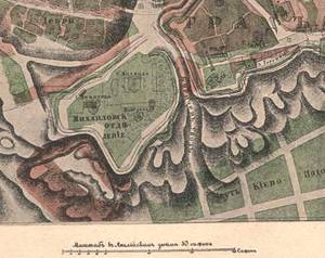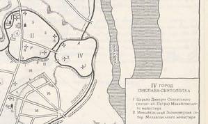 Я предположил, что земли монастырской слободы, прилегающие к крепостным валам и стенам Верхнего города, с момента заложения Михайловской церкви были разделены на земли Дмитриевского и Михайловского монастырей. Это ясно видно на картине-диараме. (turbina.ru/q/photo/1/1365178/) По линии границы расположены деревянные постройки монастырей.