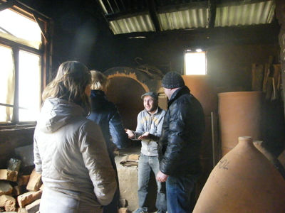 Выходим, осматриваем необычные сосуды, вокруг никого нет, мастерская закрыта. Вдруг видим, как наш проводник с кем-то беседует. Оказывается, это работник мастерской, который в свой выходной день открыл нам мастерскую, рассказал и показал, как они делают эти кувшины. Кроме кувшинов они производят небольшие глиняные печки. Ах, как мне хотелось увезти такую штуку с собой и поставить у себя на даче ... но, тяжеловата :-). По окончании экскурсии я хотела отблагодарить рассказчика и заплатить за экскурсию и... попала в неловкое положение. Что вы — что вы, какая плата! Приезжайте к нам еще!