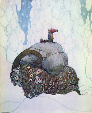 Этот козёл, согласно легендам, вместе с гномом Юльтомте (Jultomte ) перед Рождеством путешествуют по стране и раздают подарки людям, а так же приносят благословление и благосостояние.