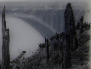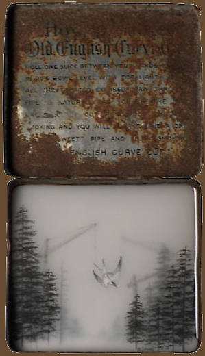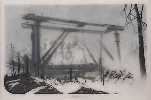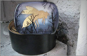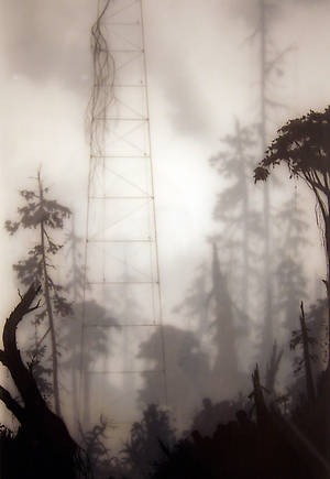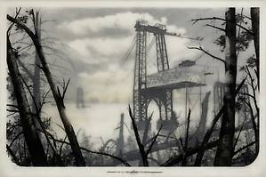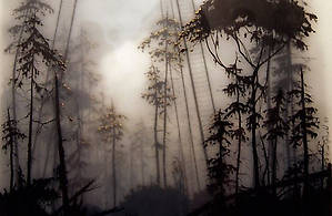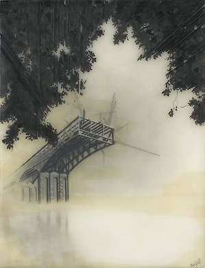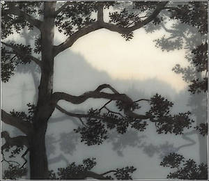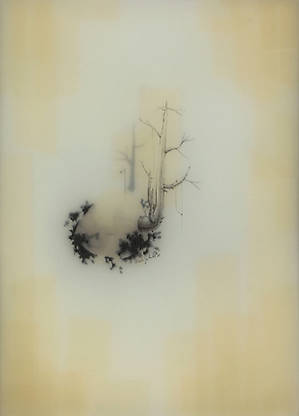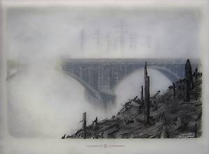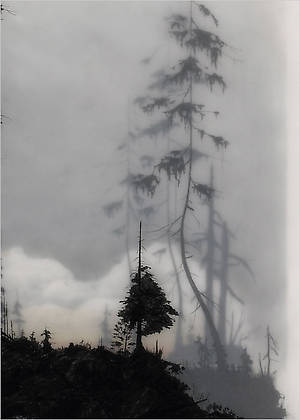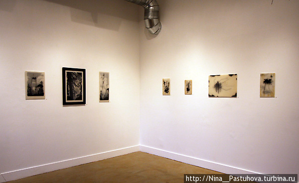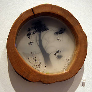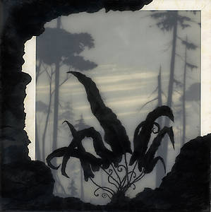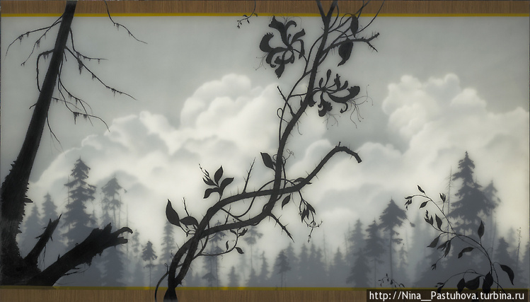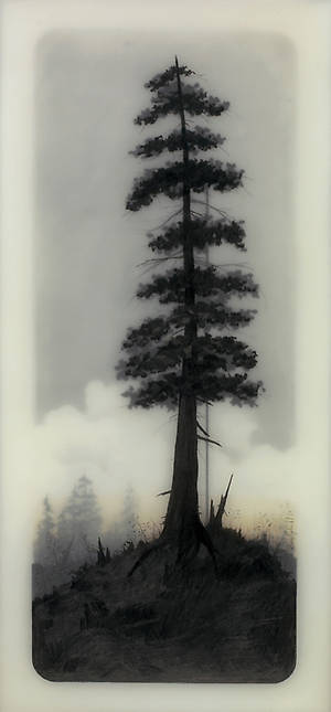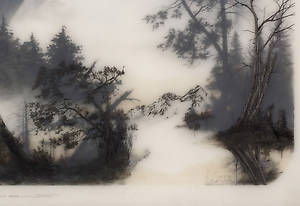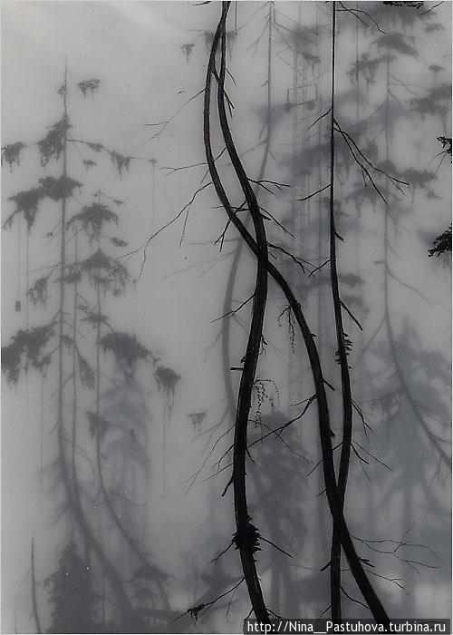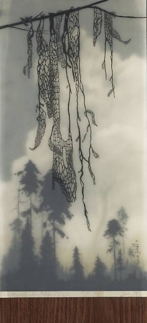 Несколько слоев рисунка графитным карандашом на прозрачной пленке и пергаменте, залитых смолой позволяют добиться необычайной глубины, рельефности и туманной загадочности.