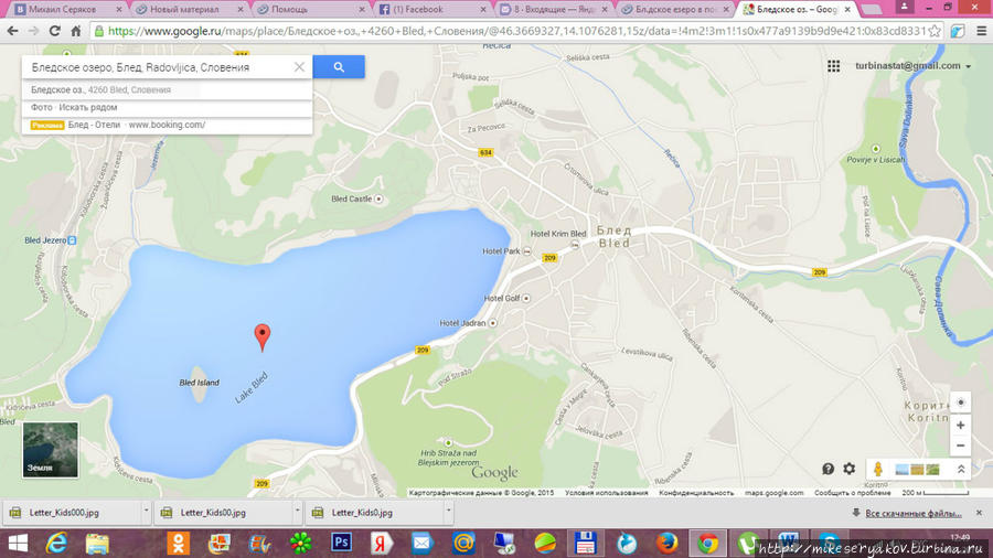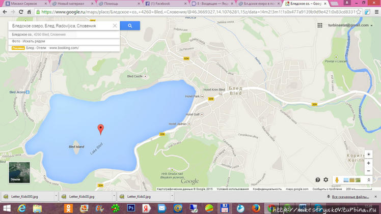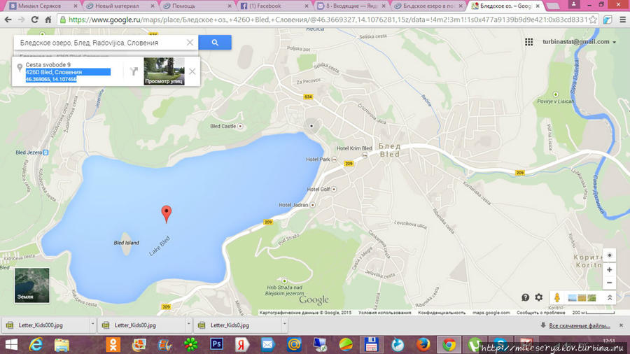 Предварительно я также открываю "гуглокарты" и нахожу там знаменитое озеро Словении. Я примерно знаю в каком месте на озере была снята эта фотография, навожу туда курсор и нажимаю правую кнопку мыши и в открывшемся окошке левой кнопки кликаю на появившийся вопрос "что там".