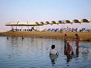 Картина вторая: Приехала группа англоязычных туристов: несколько семей с детьми. Пришли на пляж. Пока родители устраиваются, дети быстро раздеваются и с криками и визгом кидаются в море. А море, само собой, выталкивает их обратно. Вторая попытка приводит к прежним результатам, пока сердобольная израильтянка не объясняет им, как надо плавать, а заодно предупреждает, что надо беречь глаза от брызг